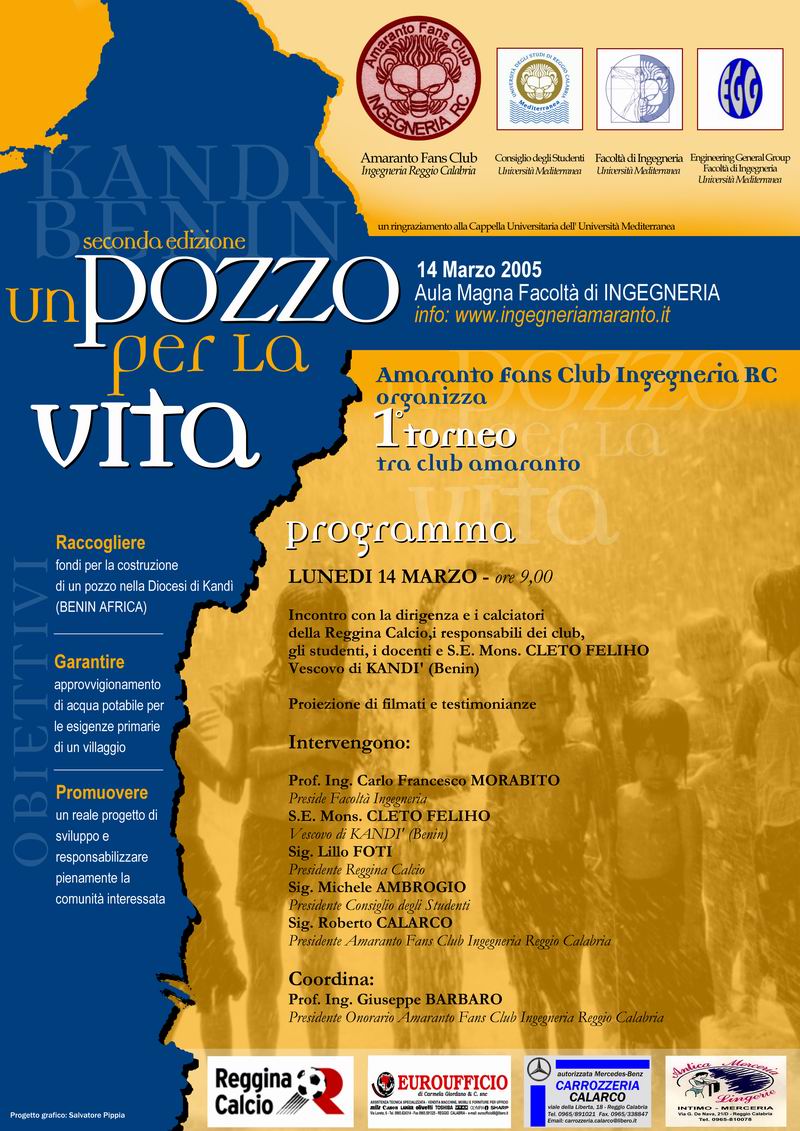 L’Associazione studentesca denominata Amaranto Fans Club Ingegneria RC col patrocinio della Facoltà di Ingegneria ed il Consiglio degli Studenti dell’Università Mediterranea di Reggio Calabria, la Cappella Universitaria e la Reggina Calcio, organizza Un pozzo per la vita manifestazione culturale–sportiva a scopo benefico.