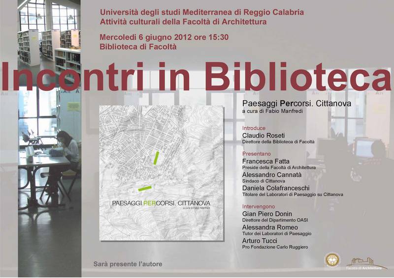 Il prossimo mercoledì 6 giugno alle ore 15:30 nella Biblioteca di Facoltà, presenteremo il volume "Paesaggi Percorsi. Cittanova" a cura di Fabio Manfredi..