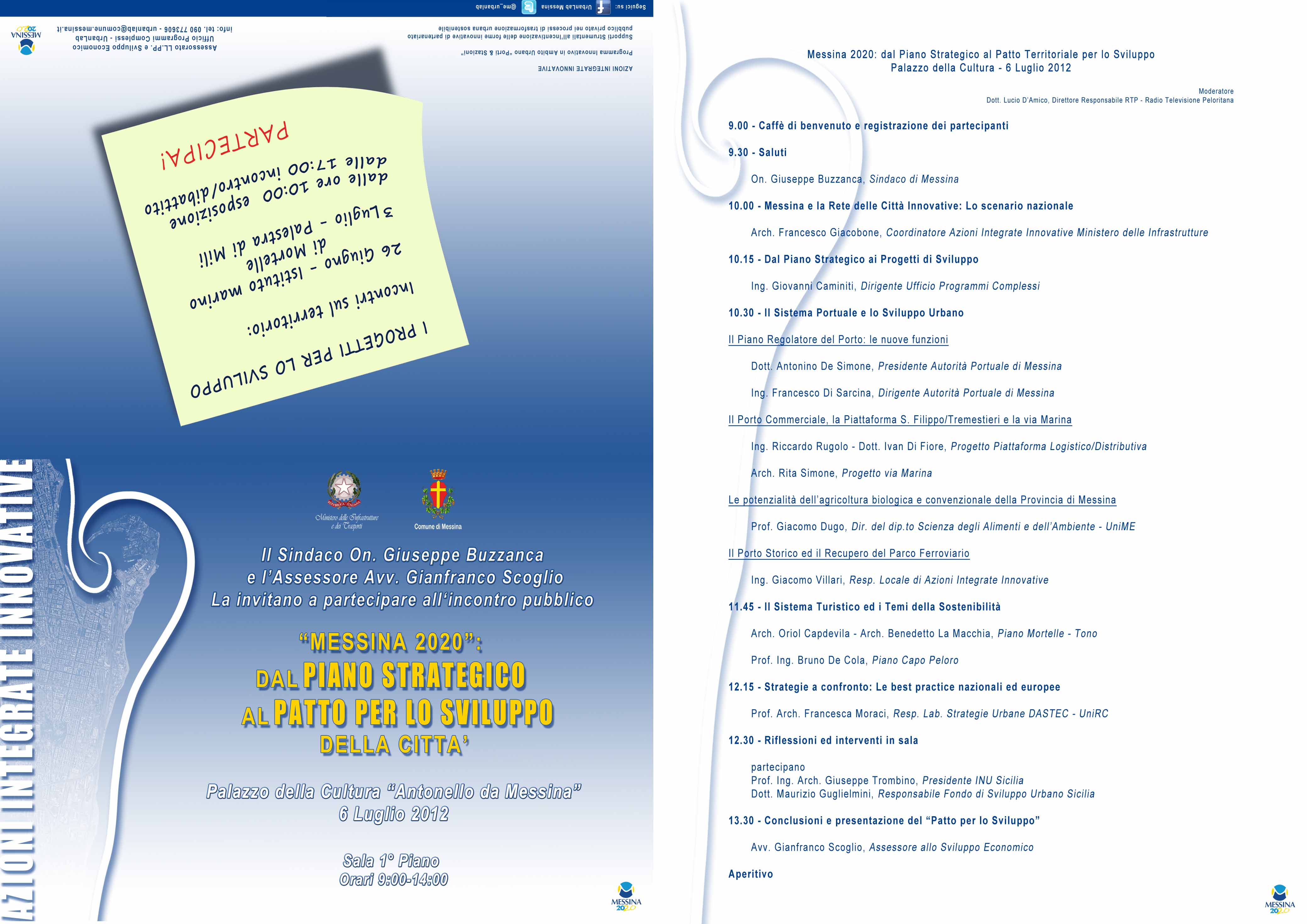 Un ciclo di incontri già avviato il 26 giugno u.s., che proseguirà il 3 luglio al Palasport di Mili e si concluderà il 6 luglio 2012 presso il Palazzo della Cultura di Messina, sede dell’UrbanLab, con una prima riflessione che mira ad individuare e concertare le istanze e le azioni concrete che dal Piano Strategico e dai progetti in cantiere definiscano il “Patto per lo Sviluppo della Città”.