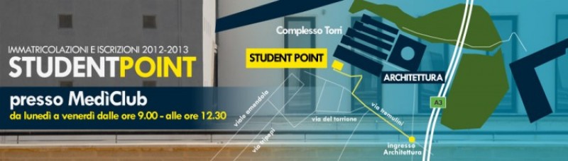 Per informazioni e assistenza agli studenti nelle procedure on line di immatricolazione ed iscrizione, anche in relazione ai servizi per il diritto allo studio è operativo lo Student Point, presso il MedìClub, Centro Polivalente dell’Ateneo, situato presso la Cittadella Universitaria Complesso Torri, con accesso dal cancello principale del Lotto D.