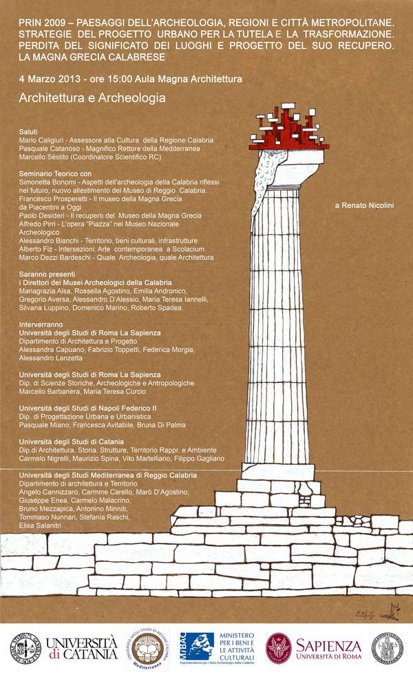 Il convegno intende focalizzare l'attenzione sullo stretto legame evidente tra Architettura e Archeologia, intese nelle loro valenze specifiche e capaci di generare, al di là degli steccati disciplinari, un surplus energetico, in cui i progetti, le proposte tematiche sappiano integrarsi e convivere in un territorio difficile e affascinante come la Calabria. Gli ospiti (di chiara fama) invitati a concorre alla definizione di strategie progettuali e di governo del territorio offriranno, dai loro punti di vista, spigolature e angolazioni visive sull'operare dell'architetto e dell'archeologo.