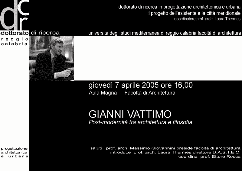 Giovedì 7 aprile alle ore 16.00, presso l'aula magna della facoltà di Architettura, conferenza di Gianni Vattimo: Post-modernità tra architettura e filosofia? Moderatore Ettore Roccasaluti del preside Massimo Giovannini