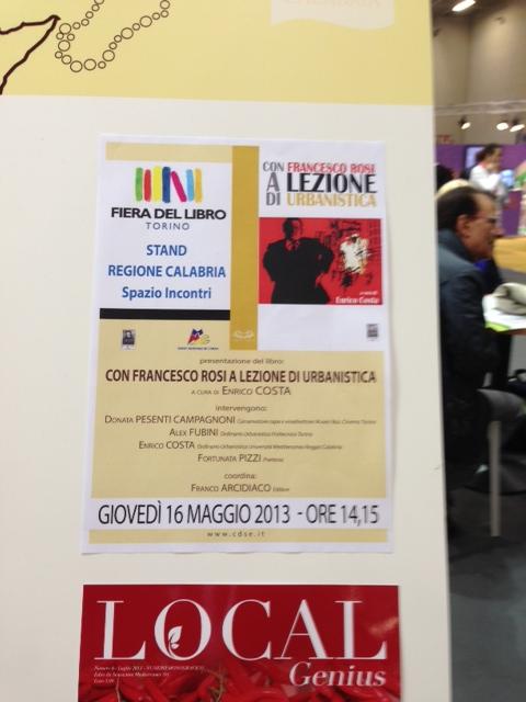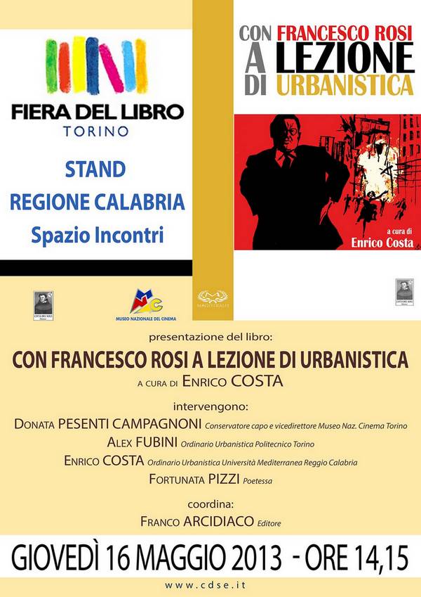 Giovedì 16 maggio 2013 al Salone internazionale del Libro di Torino - ore 14.15 - presso lo Stand Calabria/Spazio Incontri, il Prof. Alex Fubini, ordinario di Urbanistica al Politecnico di Torino, la dott.sa Donata Pesenti Campagnoni, conservatore capo e vice direttore del Museo Nazionale del Cinema di Torino e la poetessa Natina Pizzi discuteranno con il prof. Enrico Costa del suo libro “Con Francesco Rosi a Lezione di Urbanistica”. Coordina Franco Arcidiaco, editore.
