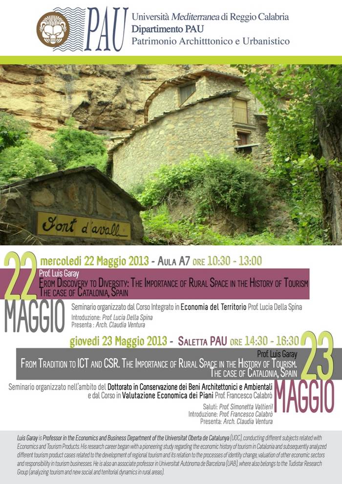 Il Dipartimento PAU, nei giorni 22 e 23 maggio ospiterà un protagonista internazionale della ricerca sul turismo rurale, il prof. Lluis Garay del Dipartimento di Economia e Business della Universitat Oberta de Catalunya.