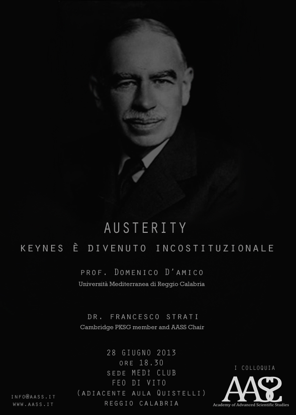 ll 28 giugno alle ore 18:30, presso il Medì Club (Università Mediterranea - Salita Melissari) si terrà il Colloquium “Austerity – Keynes è divenuto incostituzionale” in cui si cercherà di spiegare il tema delle politiche di "Austerity" europee messe in atto soprattutto durante questi ultimi anni.