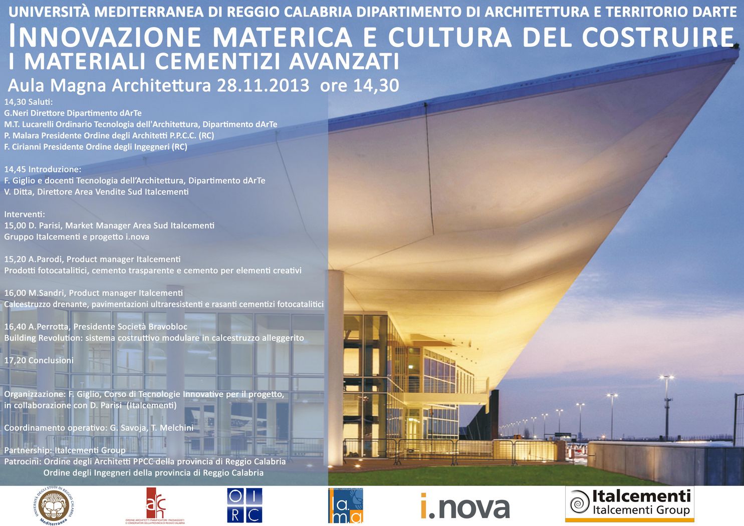 Il seminario è organizzato all'interno del Corso di Tecnologie innovative per il progetto, CdL Architettura UE, dipartimento dArTe, in collaborazione con la Italcementi Group e con il patrocinio dell’Ordine degli Architetti PPC della provincia di Reggio Calabria e dell’Ordine degli Ingegneri della provincia di Reggio Calabria.