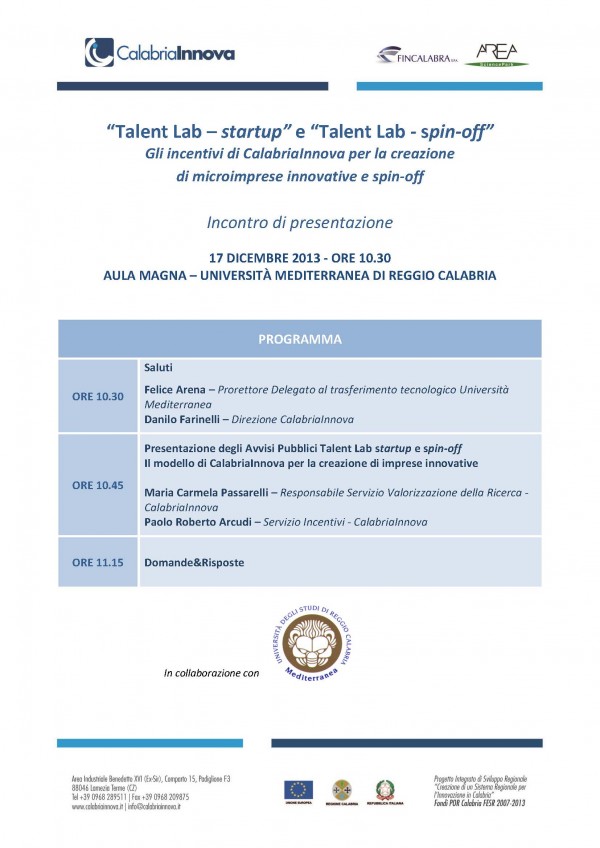 Talent Lab (spin-off e startup), invece, è il nuovo modello che CalabriaInnova ha creato per quanti provengono dal mondo della ricerca regionale o hanno un’idea innovativa e vogliono confrontarsi con la creazione di una nuova impresa, acquisendo tutte le competenze utili ad affrontare la sfida dell’imprenditorialità. Talent Lab supporta gli aspiranti imprenditori con formazione, consulenza e assistenza per far acquisire gli strumenti operativi necessari per partire: business plan, analisi di mercato e marketing dei prodotti science-based, tutela della proprietà intellettuale, project management.