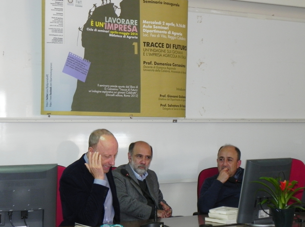 Mercoledì 2 aprile a Reggio Calabria ha avuto inizio il ciclo di seminari “Lavorare è un’impresa” promosso dalla Biblioteca del Dipartimento di Agraria dell’Università Mediterranea. Il seminario inaugurale ha avuto come protagonista Domenico Cersosimo (professore di Economia Regionale dell’Università della Calabria) che ha svolto il tema “Tracce di Futuro: i giovani e l’impresa agricola in Italia”.