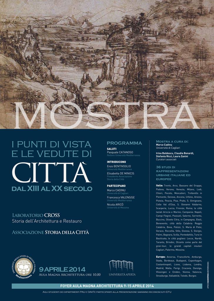 Relazioneranno Marco Cadinu, curatore della mostra, Francesca Valensise e Nicola Aricò, autori di contributi pertinenti la Calabria e Messina. La mostra, che sarà aperta al pubblico sino al 15 aprile 2014, contiene una sintesi delle ricerche sulle differenti tecniche di rappresentazione adoperate per ritrarre città europee tra il tardo Medioevo e il Novecento. Se ne discusse in una serie di Convegni, i cui contributi sono stati editi in due volumi nella Rivista Nazionale Storia dell'Urbanistica (2010).