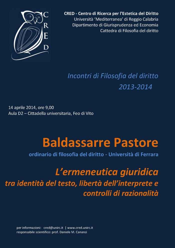 Il CRED, Centro di ricerca per l'estetica del diritto attivo da alcuni anni nel Dipartimento di Giurisprudenza ed Economia, avvia il ciclo annuale di Incontri di Filosofia del diritto in cui diversi studiosi che animano l'attuale dibattito internazionale si confrontano su tematiche di interesse gius-filosofico.