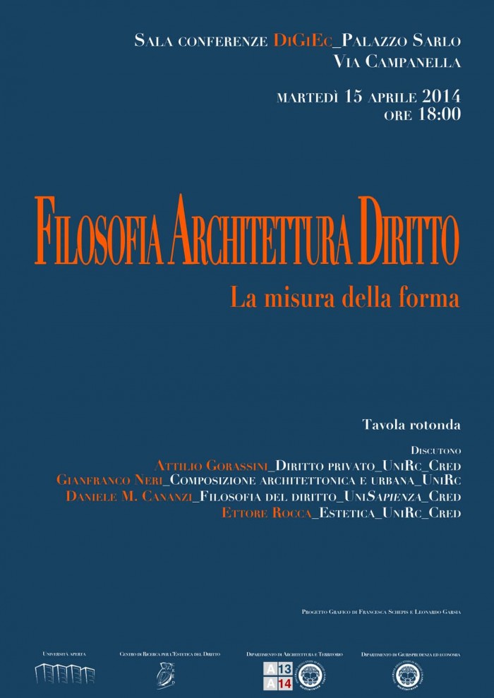 Verranno affrontati i rapporti tra la filosofia, il diritto e l'architettura. Le questioni della forma e della misura costituiranno l'ambito di riferimento entro (e oltre) il quale individuare possibili quanto auspicabili attraversamenti tematici e concettuali.