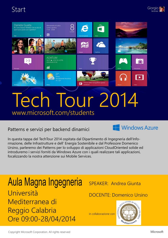 In questa tappa del TechTour 2014, ospitata dal Dipartimento di Ingegneria dell’Informazione, delle Infrastrutture e dell’ Energia Sostenibile e dal professore Domenico Ursino, si parlerà dei Patterns per lo sviluppo di applicazioni CloudOriented solide ed i servizi forniti da Windows Azure con i quali realizzare tali applicazioni, focalizzando l'attenzione sui Mobile Services.