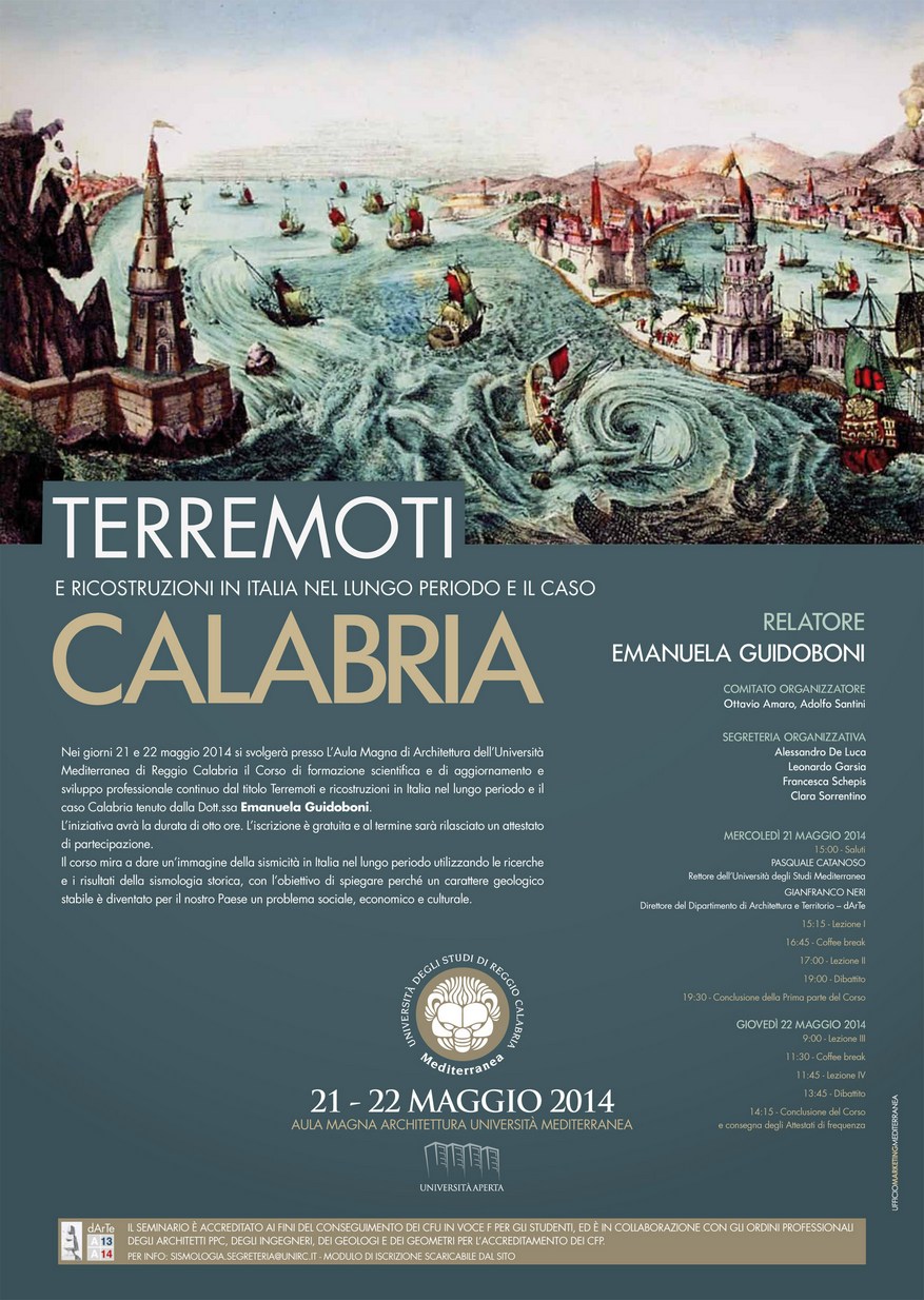 Nei giorni 21 e 22 maggio si svolgerà presso L’Aula magna di Architettura dell’Università Mediterranea di Reggio Calabria il Corso di formazione scientifica, di aggiornamento e sviluppo professionale continuo dal titolo Terremoti e ricostruzioni in Italia nel lungo periodo e il caso Calabria tenuto dalla dott.ssa Emanuela Guidoboni.