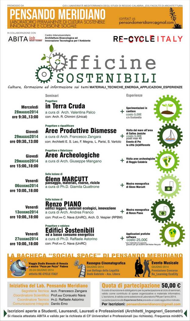 "OFFICINE SOSTENIBILI": un'idea dei giovani professionisti di Pensando Meridiano che ne promuovono le attività con il patrocinio del Centro Interuniversitario AbitaLab ed il Lab.Recycle Italy di Reggio Calabria.