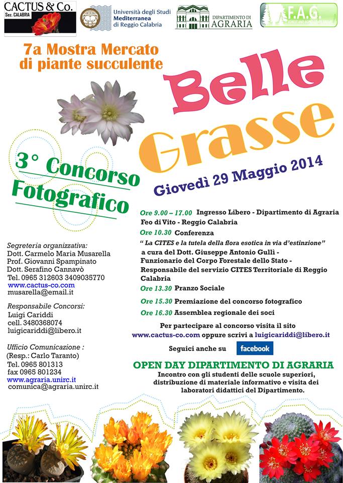 VII edizione di “BELLE GRASSE!” la Mostra-mercato di piante succulente organizzata dalla Cactus & Co. - sez. Calabria e dal Dipartimento di Agraria dell’Università Mediterranea. La manifestazione, giunta alla VII edizione, si terrà presso il Dipartimento di Agraria giovedì 29 maggio 2014 dalle 9.00 alle 17.00.