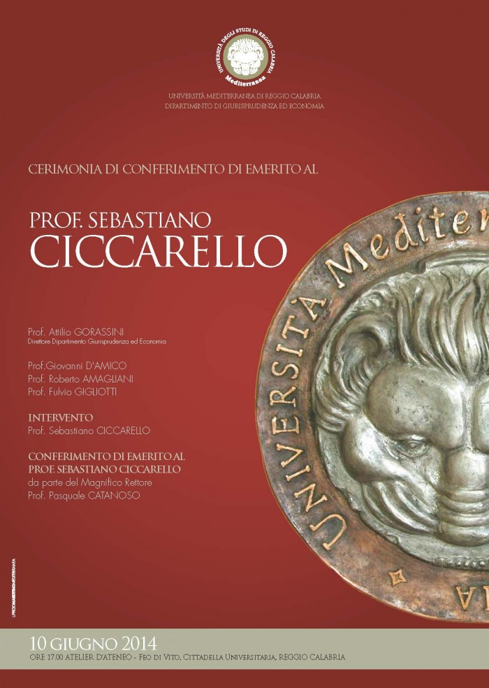 Il 10 giugno alle ore 17.00, presso l'Atelier d'Ateneo della Cittadella Universitaria, si è tenuta la cerimonia di conferimento del titolo di Professore Emerito a Sebastiano Ciccarello, ex preside della Facoltà di Giurisprudenza.