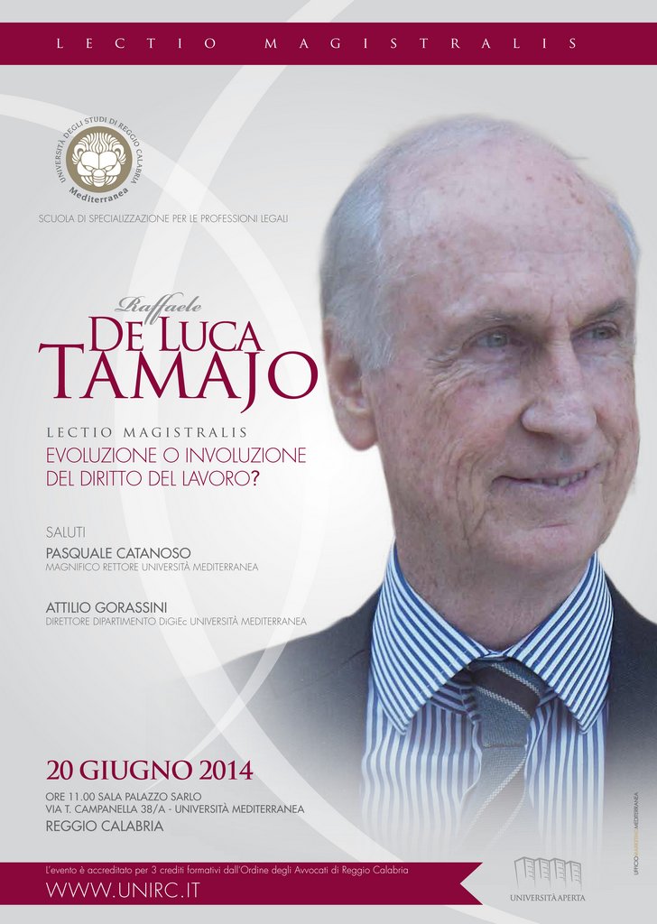 Il prof. Raffaele De Luca Tamajo, fra i più noti giuslavoristi italiani, già presidente dell'Associazione Italiana degli studiosi di Diritto del lavoro, terrà una lectio magistralis dal titolo "Evoluzione o involuzione del diritto del lavoro?", in cui affronterà il tema delle riforme del diritto del lavoro in tempo di crisi economica.
