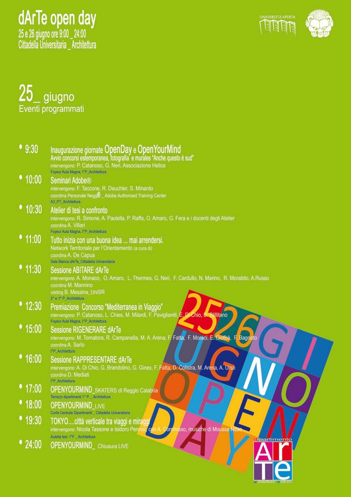 Anche quest’anno il Dipartimento dArTe si apre all’esterno proponendo due giornate di confronto sulle esperienze legate alla Didattica, agli Atelier di Tesi e alla Internazionalizzazione. In aggiunta a ciò: conferenze, mostre, musica live, performance, premiazioni e sperimentazioni.