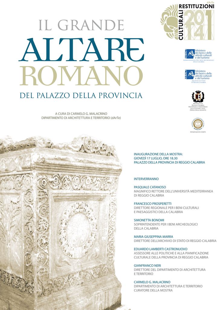 Il progetto ‘Restituzioni Culturali’, promosso dal Dipartimento di Architettura e Territorio (dArTe) dell’Università Mediterranea in collaborazione con la Soprintendenza per i Beni Archeologici della Calabria, la Provincia di Reggio Calabria e l’Archivio di Stato di Reggio Calabria, presenta la mostra ‘Il grande altare romano del Palazzo della Provincia’.