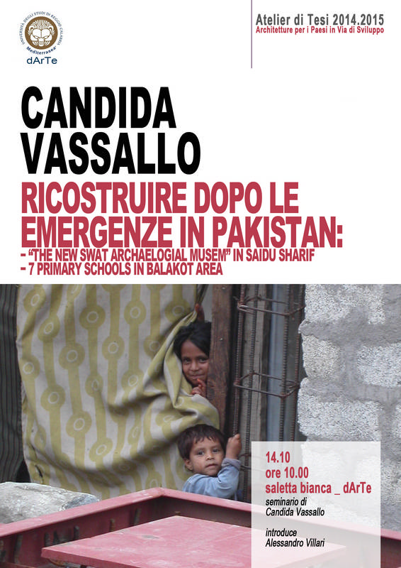 Nell’ambito delle attività dell’Atelier di Tesi “Architettura per i paesi in via di sviluppo”, attivato dal Dipartimento dArTe, il giorno 14.10.2014 alle ore 10,00 nella Saletta Bianca del Dipartimento si svolgerà il seminario dell’arch. Candida Vassallo dal titolo “RICOSTRUIRE DOPO LE EMERGENZE IN PAKISTAN”.
