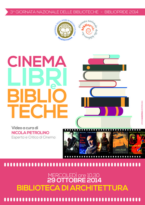 La Biblioteca di Architettura organizza per mercoledì 29 Ottobre 2014 alle ore 10.30, nell’ambito di Bibliopride 2014, la proiezione del video “Cinema, libri e biblioteche” a cura di Nicola Petrolino, esperto e critico di cinema.