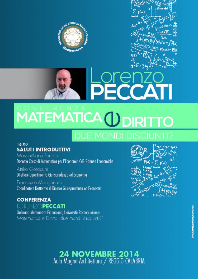 Nell'ambito dell'attività didattica della Cattedra di Metematica per l'Economia del Corso di Laurea in Scienze Economiche, il prossimo 24 novembre alle ore 16 presso l'Aula Magna di Architettura, il prof. Lorenzo Peccati dell'Università Bocconi terrà una Conferenza dal titolo: "Matematica e Diritto: due mondi disgiunti?".