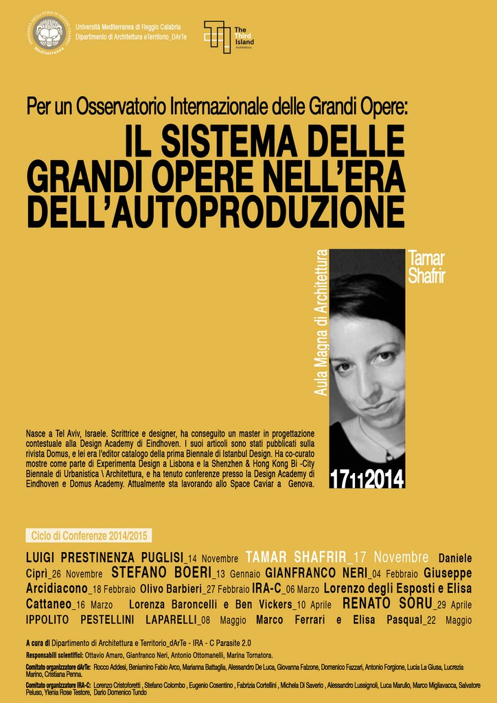 Protagonista della seconda conferenza è Tamar Shafrir che interverrà sul tema "Il sistema delle grandi infrastrutture nell'era dell'autoproduzione".