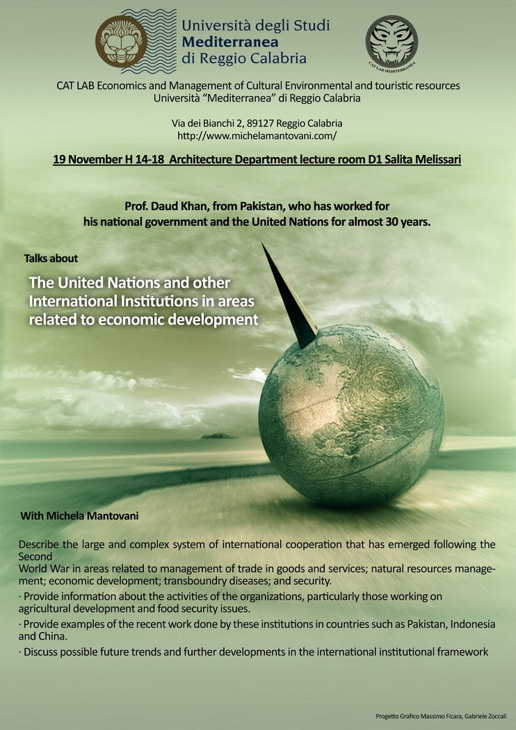 Il 19 novembre dalle ore 14 alle 18 in Aula D1 di Architettura, il CAT LAB (Laboratorio di economia e management delle risorse culturali, ambientali e turistiche), nell’ambito dei corsi di economia industriale e scienza delle finanze tenuti dalla prof. Michela Mantovani organizza il seminario "The United Nations and other International Institutions".