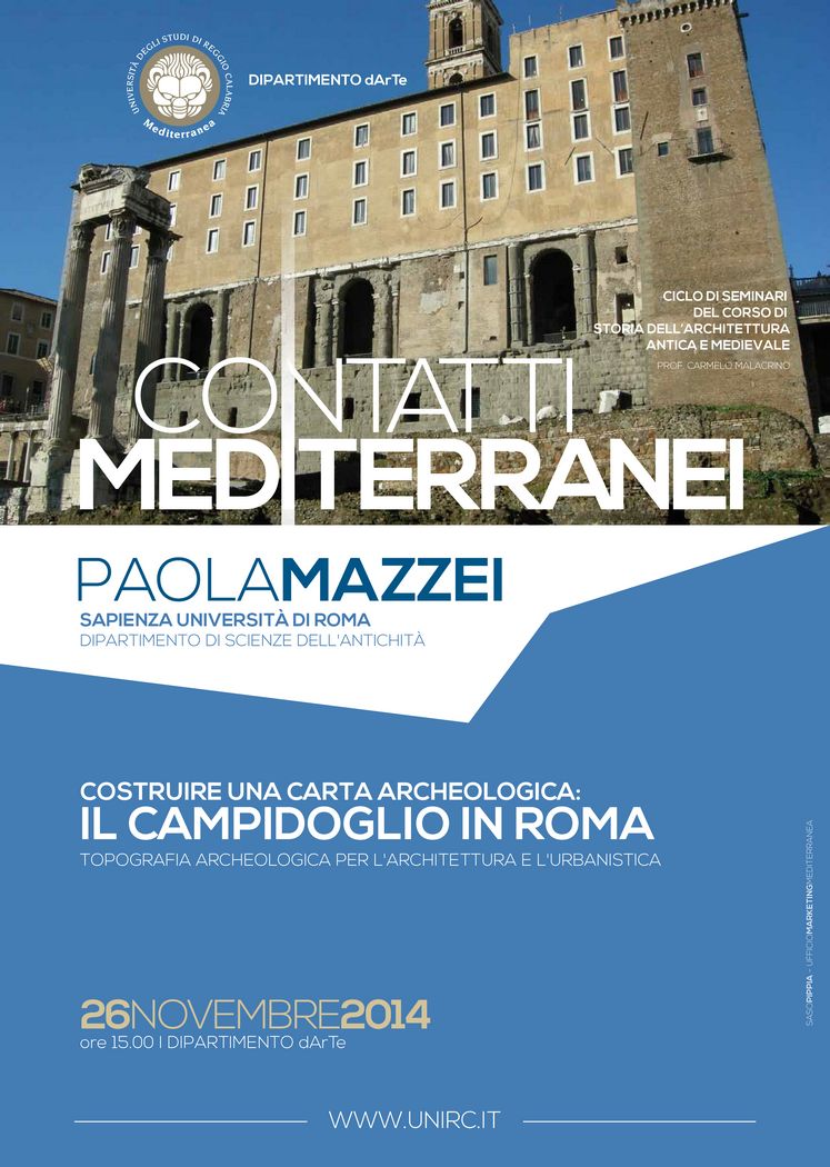 Nell'ambito dell'attività didattica del corso di Storia dell’Architettura Antica e Medievale del Corso di Laurea in Architettura, il prossimo 26 novembre alle ore 15 presso l'Aula A4 di Architettura, la dott.ssa Paola Mazzei, della Sapienza Università di Roma, Dipartimento di Scienze dell'Antichità, terrà un seminario dal titolo: "Costruire una carta archeologica: il Campidoglio in Roma. Topografia archeologica per l'architettura e l'urbanistica".