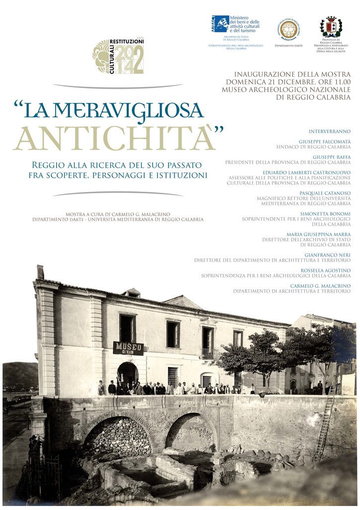La Soprintendenza per i Beni Archeologici della Calabria, il Dipartimento di Architettura e Territorio dell’Università Mediterranea di Reggio Calabria e l’Archivio di Stato di Reggio Calabria, in associazione con l’Assessorato Politiche e Pianificazione Culturale-Beni Culturali-Difesa della Legalità della Provincia di Reggio Calabria, sono lieti di presentare la mostra documentaria “La meravigliosa antichità. Reggio alla ricerca del suo passato fra scoperte, personaggi e istituzioni”, che si terrà dal 21 dicembre 2014 al 31 gennaio 2015 presso il Museo Archeologico Nazionale di Reggio Calabria.