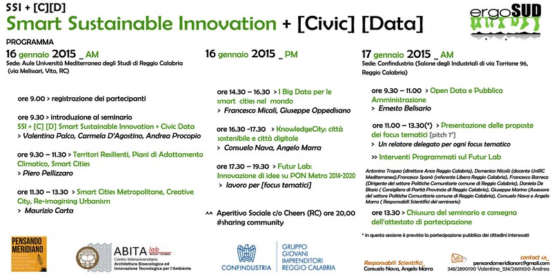 Dopo la prima edizione del sett.2013, fondativa sui temi della programmazione comunitaria europea e dell’innovazione diretta allo sviluppo sostenibile locale dei territori del Sud per il protagonismo delle giovani generazioni, il Lab.Pensando Meridiano insieme all’Associazione Giovani Industriali di Reggio Calabria e con il partenariato scientifico del centro interuniversitario ABITALab, propone due giornate di seminario denominato SSI + [C] [D] smart sustainable innovation + Civic Data, sui temi contemporanei dell’innovazione urbana e dello città digitale per le smart cities metropolitane.