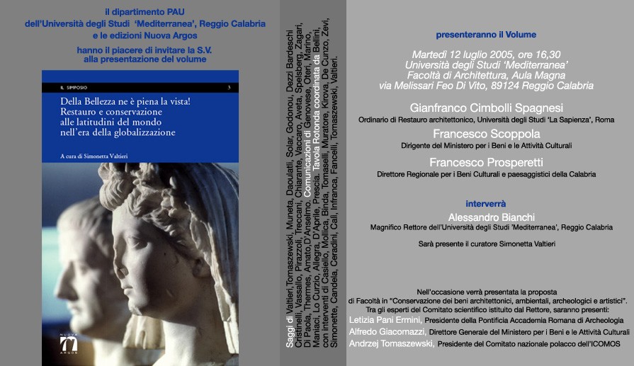Aula magna della facoltà di Architettura ore 16,30. Titolo del volume curato dalla professoressa Simonetta Valtieri: Della bellezza ne è piena la vista! Restauro e conservazione alle latitudine del mondo nell'era della globalizzazione.