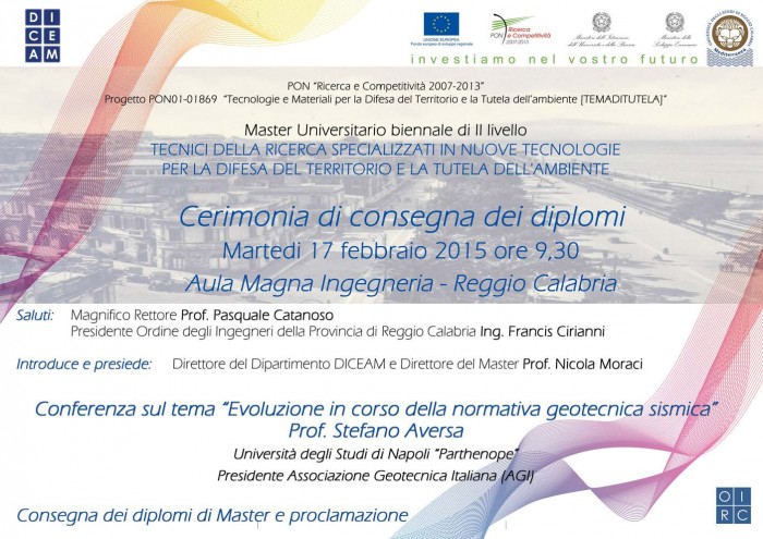 Martedì 17 febbraio alle ore 9.30, presso l'Aula Magna del plesso di Ingegneria, il prof. Nicola Moraci, direttore del Dipartimento DICEAM e direttore del Master Universitario di II livello per “Tecnici della ricerca specializzati in nuove tecnologie per la difesa del territorio e la tutela dell'ambiente”, presiederà i lavori della Cerimonia di consegna dei diplomi agli allievi, alla presenza del rettore Pasquale Catanoso e del presidente dell’Ordine degli Ingegneri della Provincia di Reggio Calabria, Francis Cirianni.