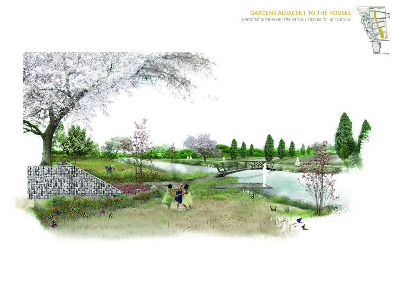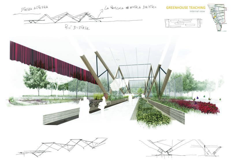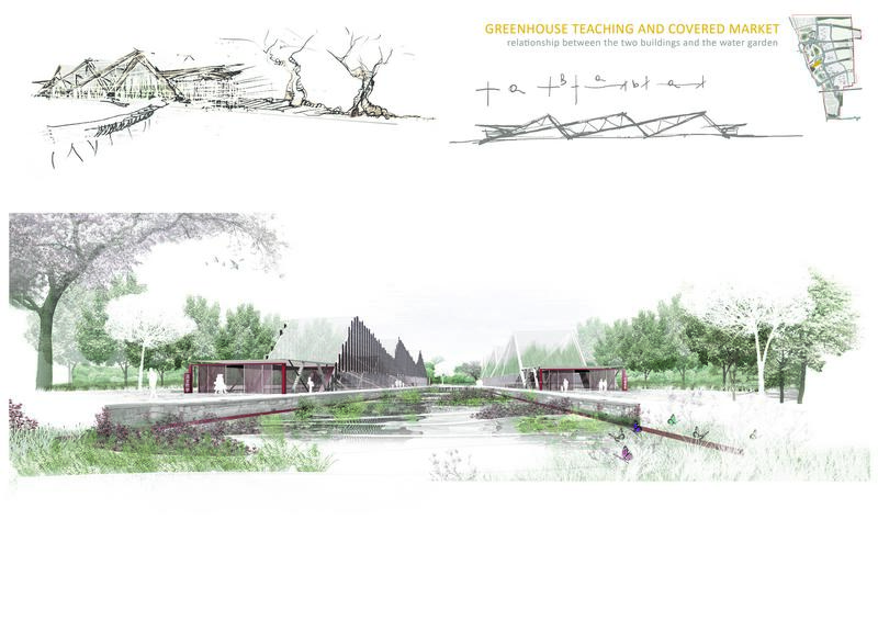 1. nella prima ad est, confinante con la nuova città in fase di costruzione, è stato collocato il parco didattico e produttivo. Una serie di edifici contribuiscono a servire diversi servizi;