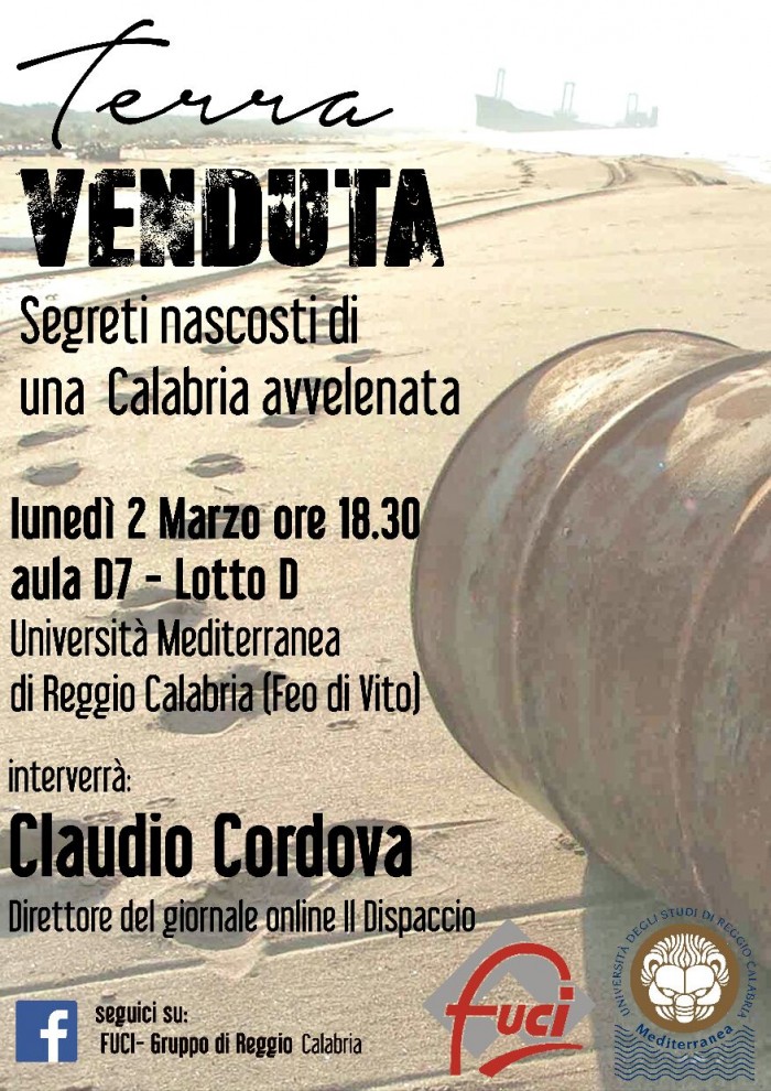 Il gruppo FUCI (Federazione Universitaria Cattolica Italiana) “don D. Farias” di Reggio Calabria organizza, in data lunedi 2 marzo, l’incontro dal titolo “TERRA VENDUTA: SEGRETI NASCOSTI DI UNA CALABRIA AVVELENATA” nel quale interverrà come relatore il dott. Claudio Cordova, direttore del giornale online “Il Dispaccio”.