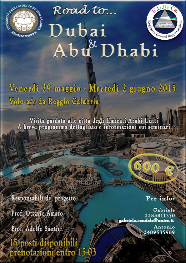 L'Associazione studentesca Eureca organizza un viaggio nei giorni 29 maggio- 2 giugno riservato agli studenti di Ingegneria ed Architettura nelle città di Dubai e Abu Dhabi.