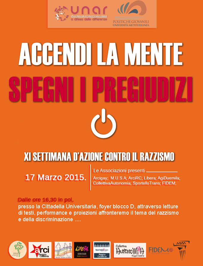 In occasione della "XI Settimana d'Azione contro il Razzismo", organizzata dall'UNAR e dalla Presidenza del Consiglio dei Ministri, martedì 17 marzo dalle ore 16,30, presso il foyer del Corpo D della Cittadella Universitaria, il tema delle discriminazioni sarà affrontato attraverso letture di testi, performance e proiezioni.