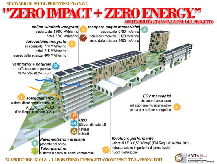 Domani, 23 aprile ore 15, presso l'aula L5 di Architettura (per il Laboratorio di Progettazione Esecutiva, docente prof.ssa G. Foti) si terrà il seminario di studi con la prof.ssa Consuelo Nava: "Zero Impact + Zero Energy". Sostenibilità ed Innovazione del Progetto".