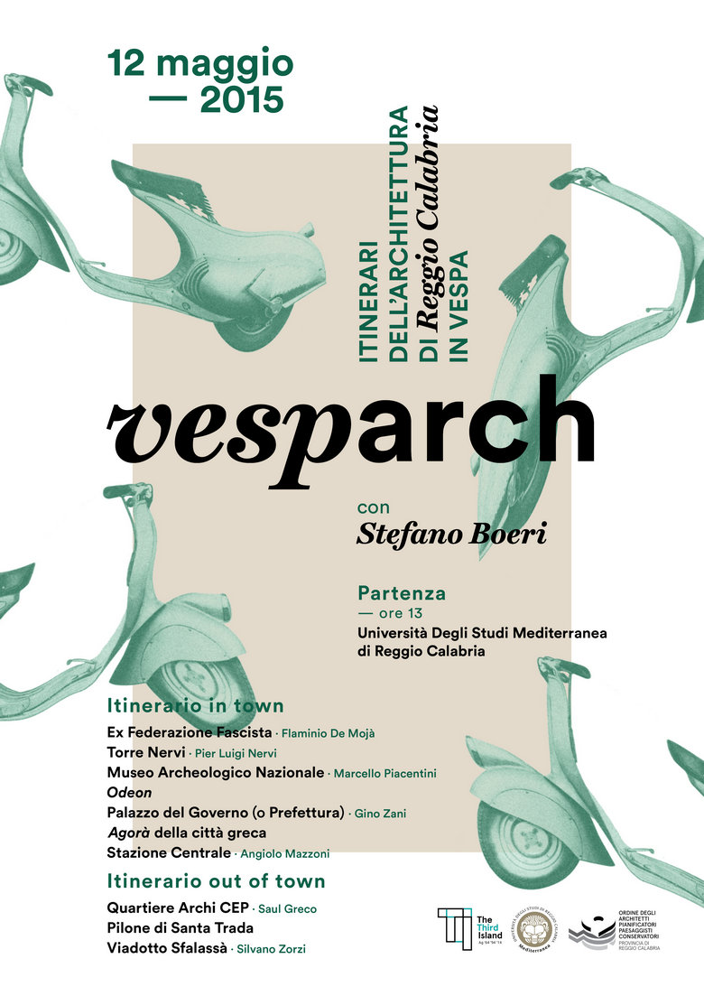 Tra le iniziative della tre giorni conclusiva di "The Third Island Ag 64’ 94’ 14’" , martedì 12 maggio alle ore 13.00 è previsto il VespArch: alla fine della sua conferenza Stefano Boeri insieme a studenti e docenti parteciperà al tour in vespa attraverso un itinerario che rilegge la città di Reggio Calabria sotto i diversi aspetti urbani ed architettonici, storici e contemporanei.