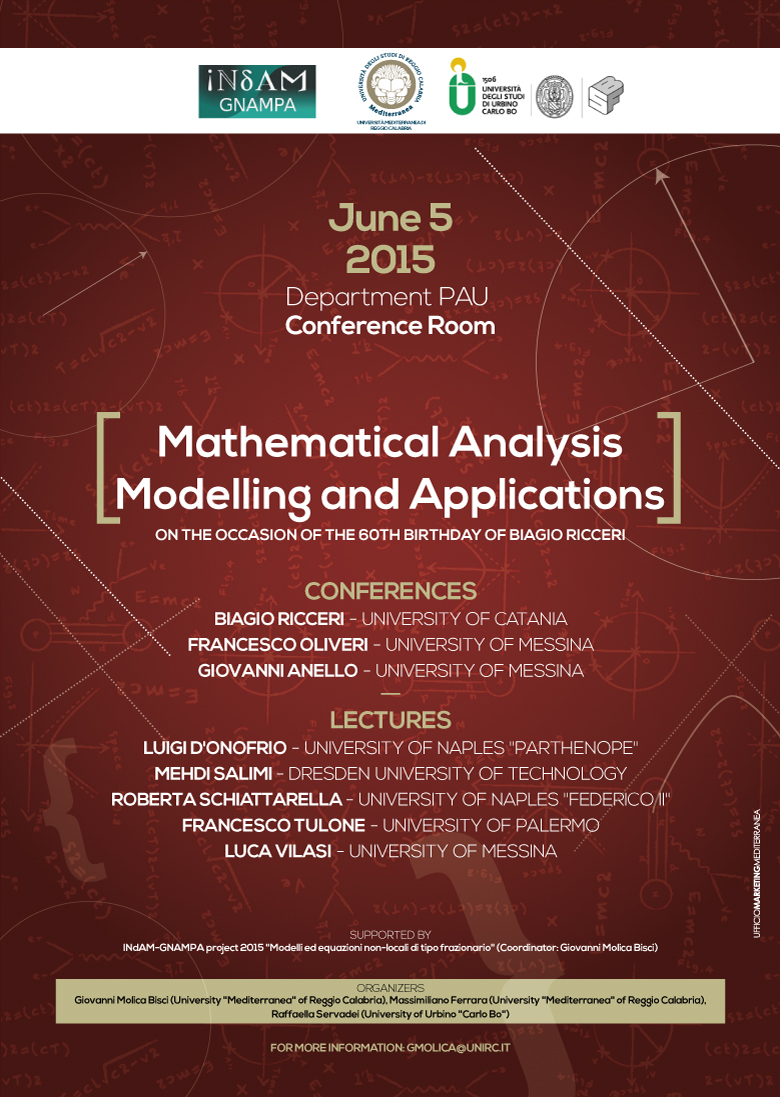 Il 5 giugno a partire dalle ore 9:00, presso la saletta conferenze del Dipartimento PAU si terrà una giornata di studio dal titolo “Mathematical Analysis Methods and Applications” in onore del sessantesimo compleanno del prof. Biagio Ricceri.