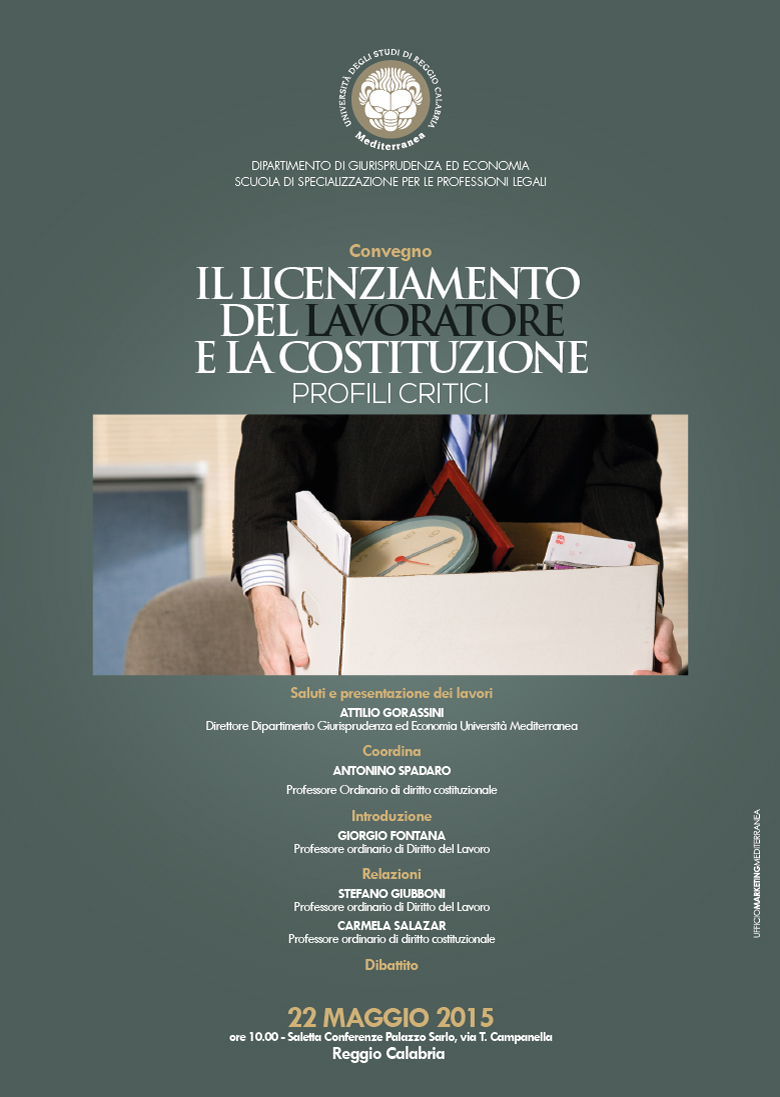 Il 22 maggio alle ore 10.00 nella Sala conferenze di Palazzo Sarlo si terrà il convegno Il licenziamento del lavoratore e la Costituzione: profili critici.
