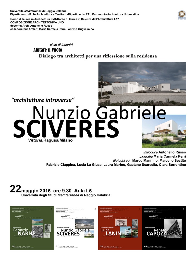 Venerdì 22 maggio, a partire dalle ore 9.30 in Aula L5 del plesso di Architettura, si svolgerà il secondo appuntamento del ciclo di incontri Dialogo tra architetti per una riflessione sulla residenza. Ospite della giornata Nunzio Gabriele Sciveres, progettista nato e cresciuto professionalmente in Sicilia con rilevanti contaminazioni con realtà culturali nazionali e internazionali.