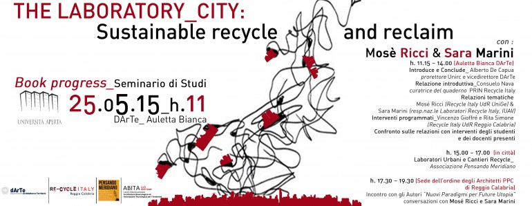 ** The laboratory_city: sustainable recycle and reclaim, è il titolo del libro di prossima uscita e a cura di Consuelo Nava, per la collana dei quaderni Recycle Italy, Aracne ed., che coinvolge sui temi di interesse della ricerca accademica PRIN in corso, molti studiosi ed esperienze nazionali ed internazionali. Un percorso che tenta di ricostruire le intenzioni del progetto per la coesione delle comunità urbane, attraverso le informazioni ed i modi con cui avviene il riciclo del territorio, delle città, dell’architettura e degli edifici, dei materiali, per strategie di re_processing nel recupero ecologico delle aree-scarto urbane e produttive (ricerca e progetti di Consuelo Nava e Giamila Quattrone). Propone la narrazione di modelli indagati attraverso le tattiche di innovazione sociale urbana, con progetti sperimentali sostenibili nei laboratori urbani ed i cantieri di riciclo condotti con gli ateliers universitari e l’associazione Pensando Meridiano, per la città metropolitana di Reggio Calabria.
