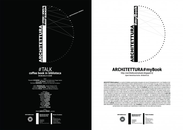 ARCHITETTURA#myBook è un evento di didattica sperimentale sviluppato nel corso di Composizione Arch.1 con l’obiettivo di stimolare una conoscenza autentica e profonda dell’architettura lontana dall’estemporaneo consumo d’immagini che oggi sempre più frequentemente contraddistingue l’approccio dello studente. L’iniziativa vuole proporsi come una reazione al diffondersi di metodi passivi di conoscenza e la mancanza di una cultura architettonica diffusa.