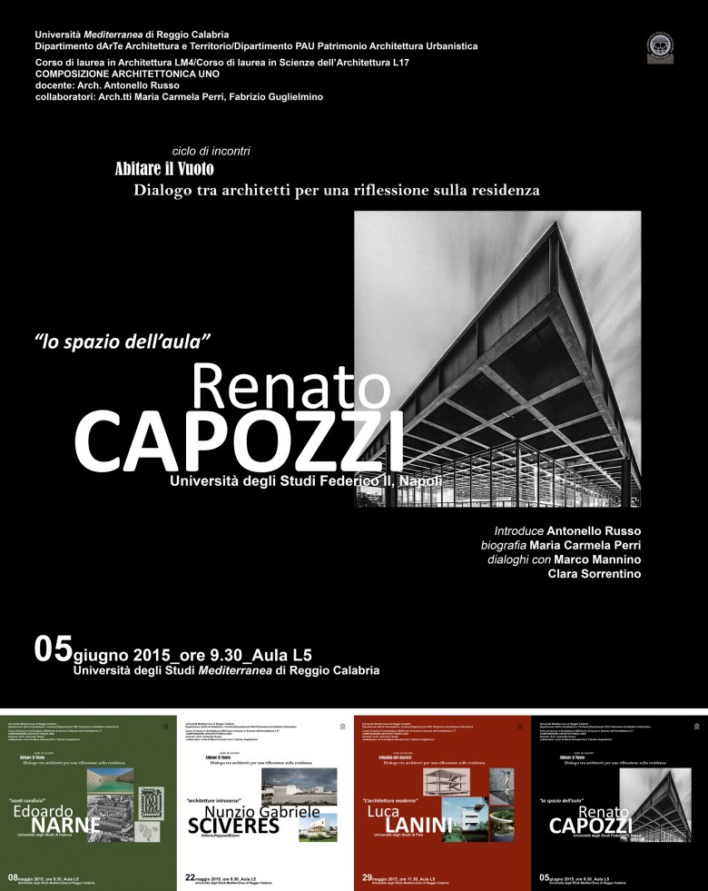 Venerdì 5 giugno, a partire dalle ore 9.30 in aula L5 del plesso di Architettura, si svolgerà il quarto e ultimo appuntamento del ciclo di incontri Dialogo tra architetti per una riflessione sulla residenza. Ospite della giornata Renato Capozzi, ricercatore in composizione architettonica e urbana presso l’Università Federico II di Napoli, con “Lo spazio dell’aula”.