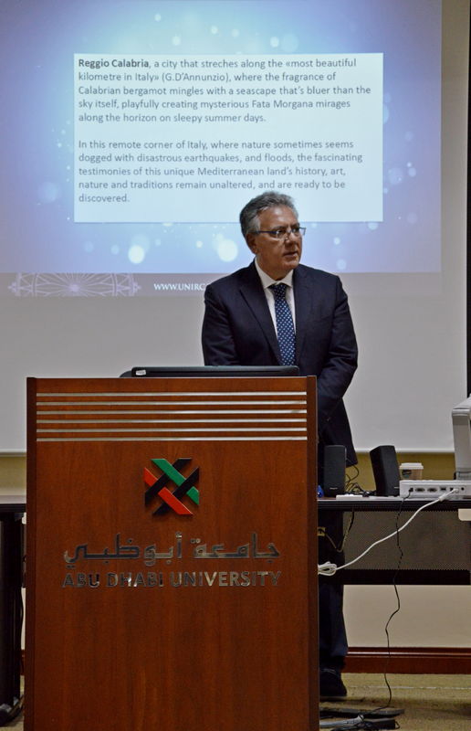 In seguito è stata svolta, in forma seminariale, un’ampia presentazione della realtà universitaria reggina, delle ricerche in atto e delle esperienze didattiche degli studenti, che si è conclusa con un proficuo dibattito con numerosi docenti e studenti dell’Università di Abu Dhabi.