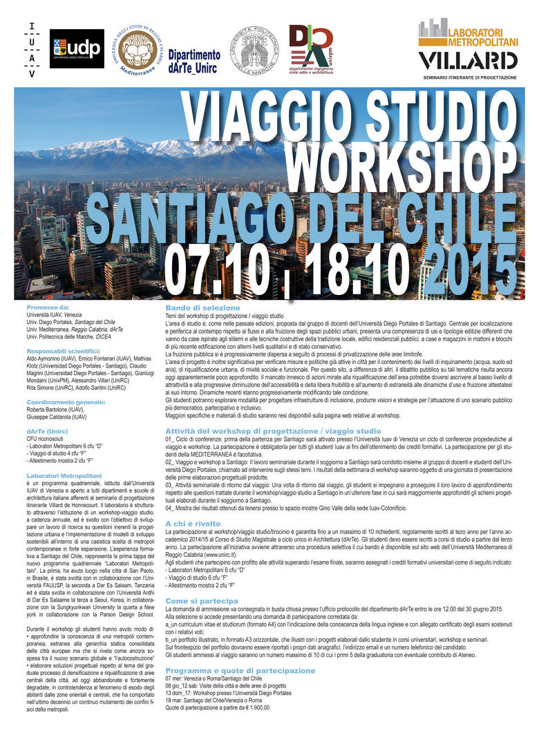 “Laboratori Metropolitani” è un programma quadriennale, istituito dall’Università IUAV di Venezia con la partecipazione delle Facoltà di Architettura italiane afferenti al Seminario di Progettazione itinerante Villard de Honnecourt ed è promosso dall’Università IUAV (Venezia) con l’Università Diego Portales (Santiago del Chile), la Università Mediterranea (Reggio Calabria), Uni. Politecnica Marche.