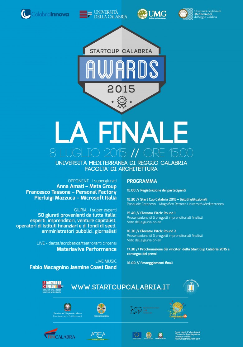 CalabriaInnova, l'Università della Calabria, l'Università Magna Graecia e l'Università Mediterranea ti aspettano alla tappa conclusiva della Start Cup Calabria 2015, la competizione tra idee innovative d’impresa che da maggio ha attraversato la regione e coinvolto oltre 100 team di startupper. L’8 luglio a partire dalle ore 15, sul palco dell'Atelier di Architettura dell’Università Mediterranea di Reggio Calabria, si sfideranno i 12 progetti d’impresa finalisti, per convincere la giuria di esperti, imprenditori, venture capitalist, giornalisti di settore, blogger, rappresentanti istituzionali e docenti universitari.