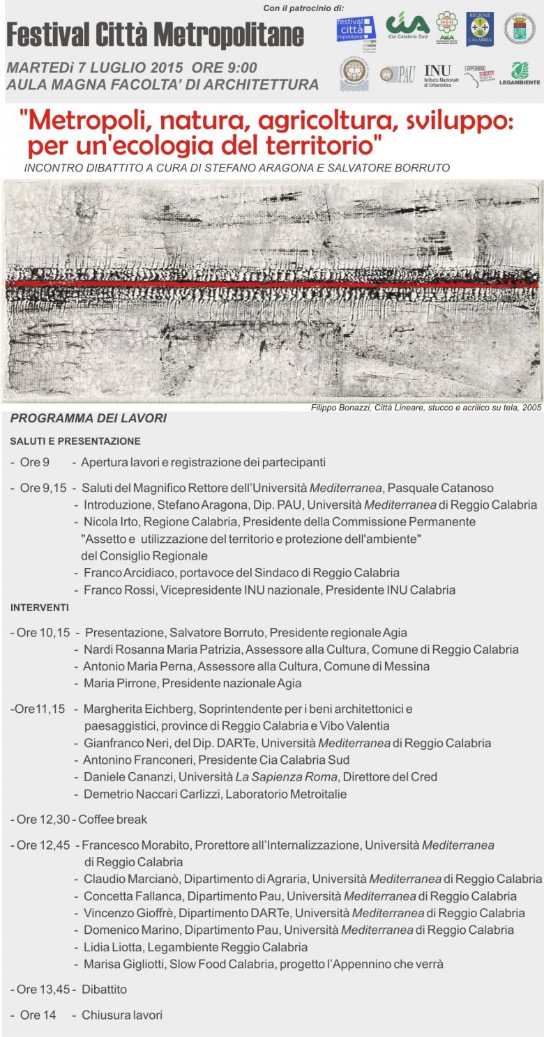 Il 7 luglio alle ore 9.00, presso l'Aula magna di Architettura, si terrà l'incontro/dibattito Metropoli, natura, agricoltura, sviluppo: per un'ecologia del territorio a cura di Stefano Aragona e Salvatore Borruto.