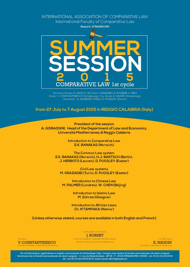 La International Faculty of Comparative Law (IFCL), che ha sede all’Università di Strasburgo, in collaborazione col Dipartimento di Giurisprudenza ed Economia dell'Università Mediterranea, terrà dal 27 luglio al 7 agosto 2015 presso il Residence universitario sito in via Manfroce, una sessione estiva del prestigioso Corso di diritto comparato che da anni si svolge all'Università di Strasburgo.